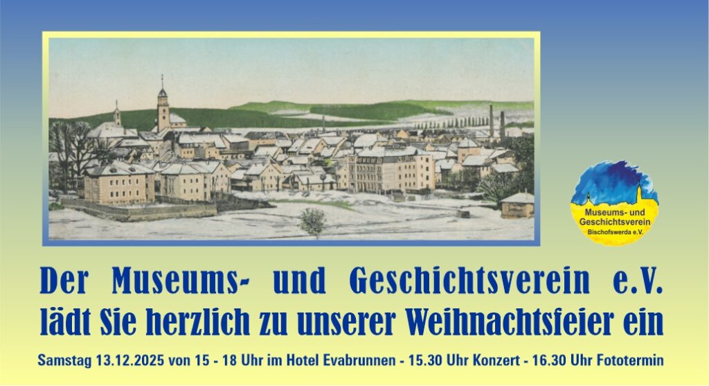 Am 13. Dezember 2025 um 15 Uhr lädt der Museums- und Geschichtsverein Bischofswerda e.V. zur gemeinsamen Weihnachtsfeier im Hotel Evabrunnen ein – mit Susann Fritzsche (Akkordeon & Gesang) (um Anmeldungen an: mgv-bischofswerda@gmx.de oder per WhatsApp 0176 268 738 80 wird gebeten)